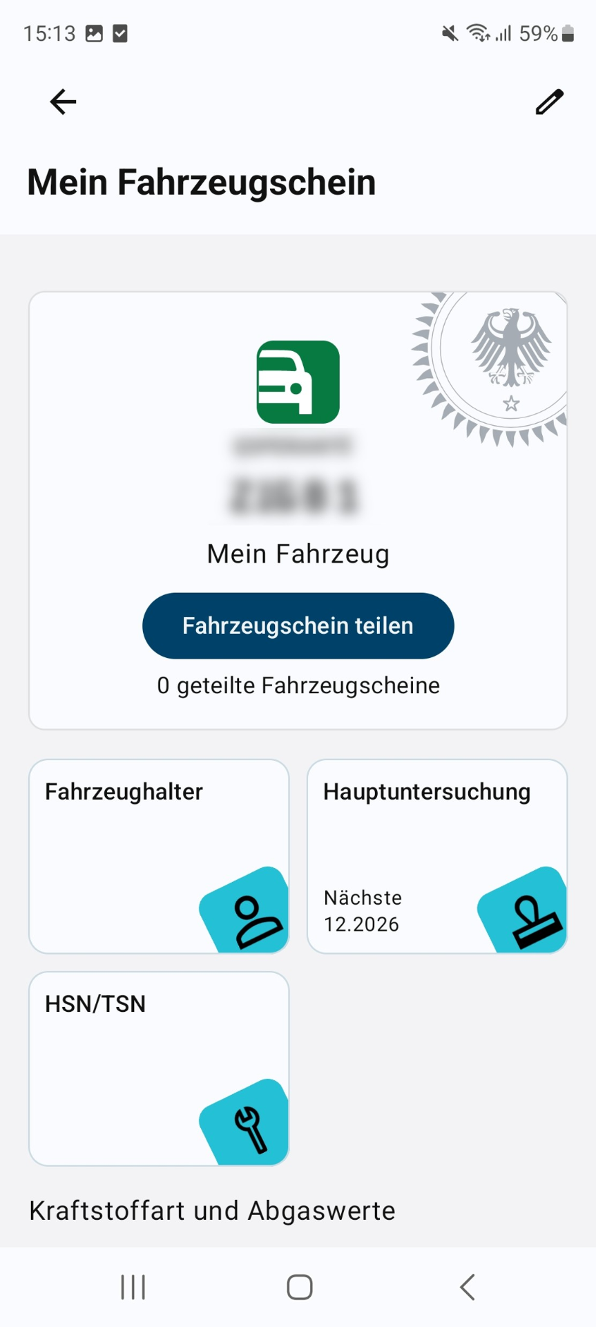 - Digitaler Fahrzeugschein (DFZ): Die Zulassungsbescheinigung Teil I wird rechtssicher auf dem Handy hinterlegt.
